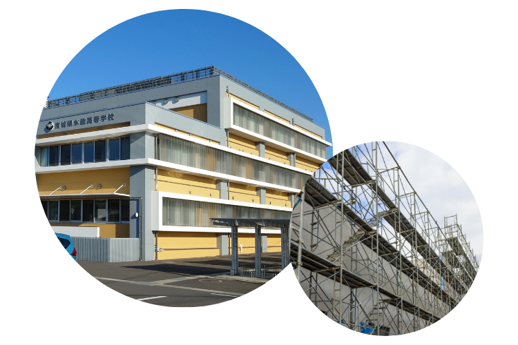 当店の塗装工事では、長年にわたり会社や工場、施設などを守ってきた外壁や屋根の補修と補強を主とする塗り替えはもちろん、地球にやさしく光熱費も抑えられる遮熱・断熱塗装や、建物だけでなく空間内の環境も守る工場メンテナンス、気分やコンセプトを変えてリフォームしたい方向けのカラーコーディネートなど、塗装全般におけるさまざまなご提案をさせていただきます。