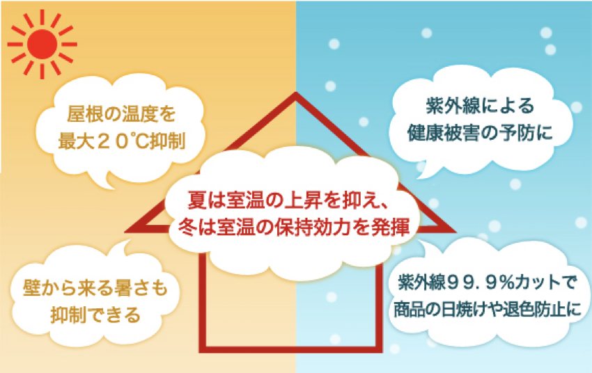 当社では、外壁・屋根・そして窓ガラスを遮熱・断熱素材でコーティングする「エコリフォーム」を承っております。図の通り建物の中が外気の影響を受けにくくなり、快適な室温を保てるようになります。また、紫外線をカットできるのも大きなメリットです。結露防止、防水・防カビ効果も期待できます。