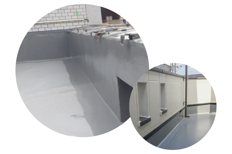 ウレタン樹脂を複数回に分けて塗布し、トップコートを塗って仕上げます。 液状の樹脂を流し込む形で施工するため、複雑な形状も綺麗に防水コーティングできます。